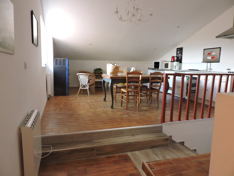 Dès l'entrée on accède à un bel espace constitué d'une cuisine américaine équipée et meublée ouverte sur un séjour salle à manger , un couloir dessert une salle d'eau , wc, un dégagement et deux chambres ( 1 lit double et 2 lits jumeaux )