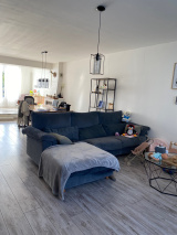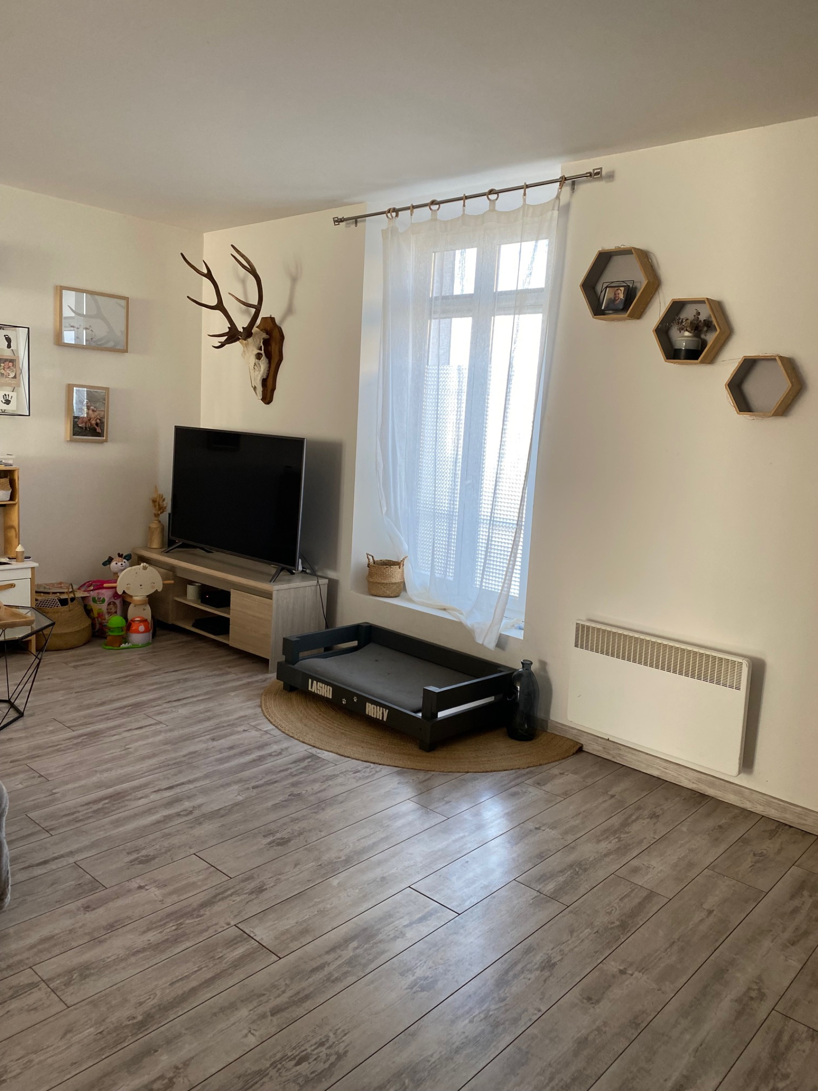 Grand Séjour lumineux avec insert , cuisine équipée avec plaque gaz et hotte , 2 chambres dont une avec balcon , salle de bains, wc