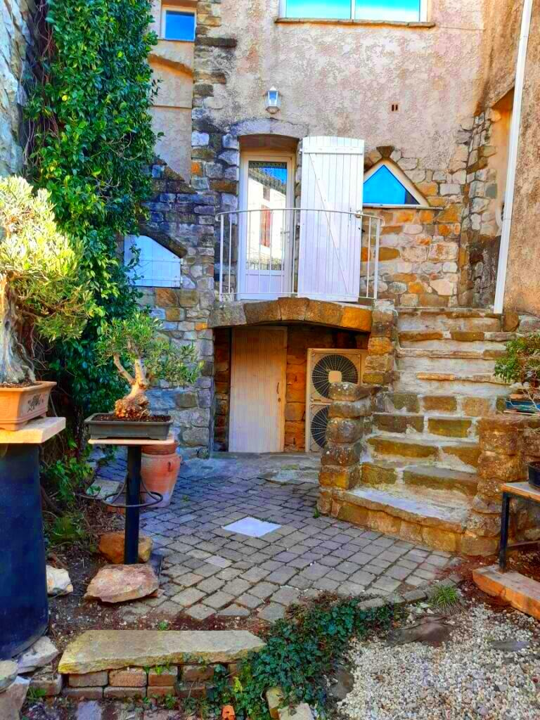 Après avoir traversé une petite cour , un escalier méne à l'entrée qui s'ouvre sur un espace de vie composé d'un salon , d'une salle à manger et d' une cuisine indépendante meublée et équipée .