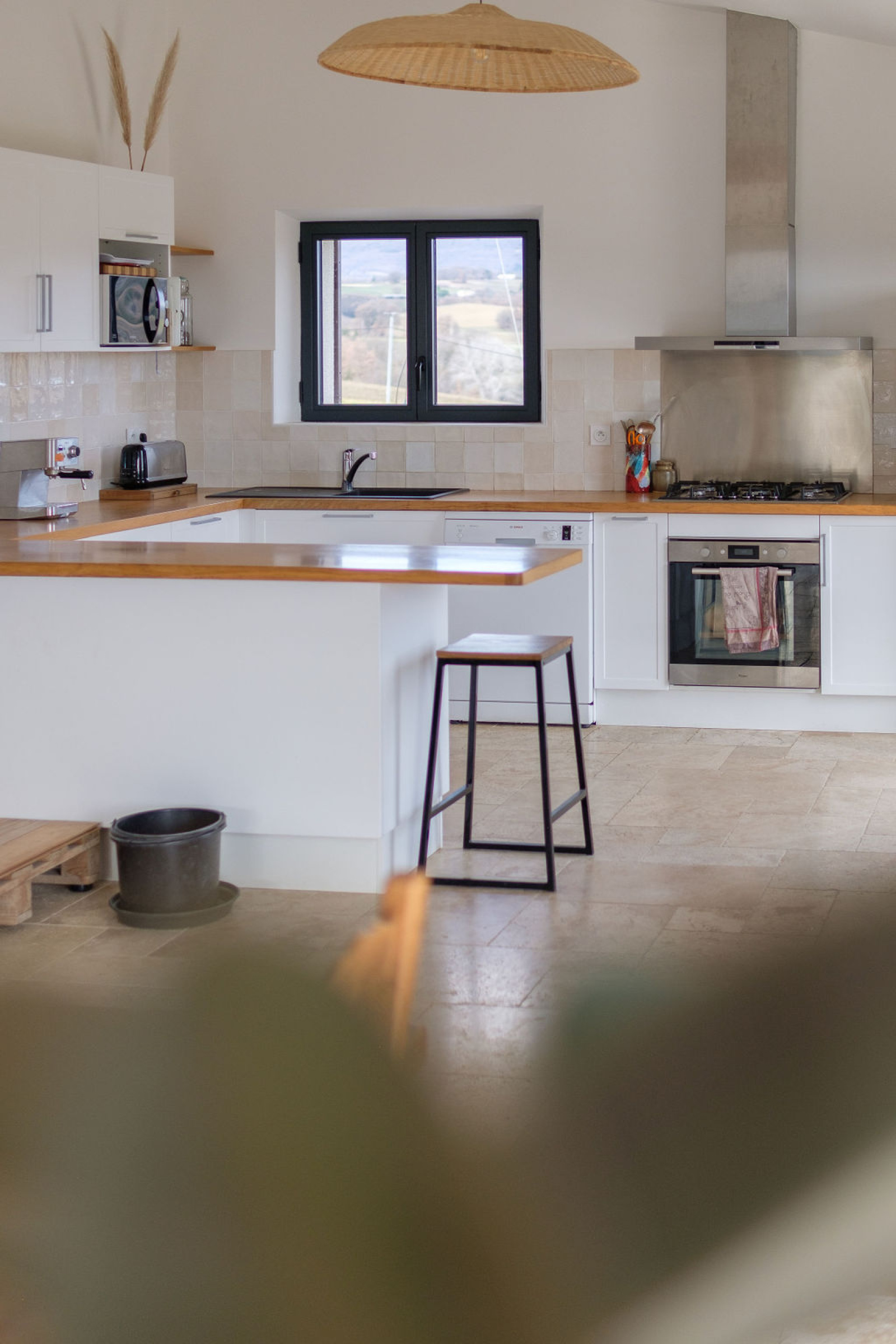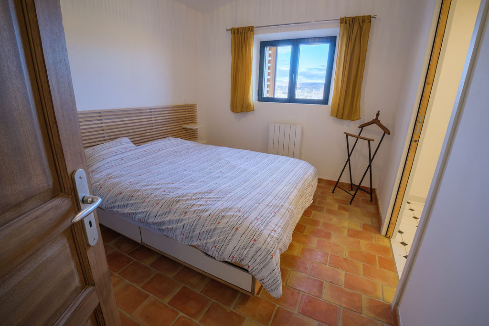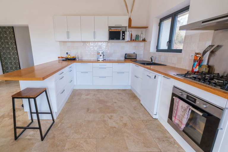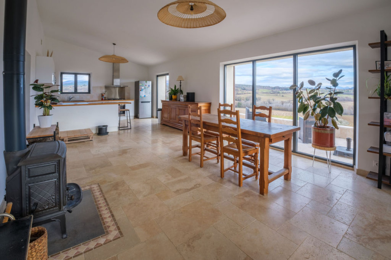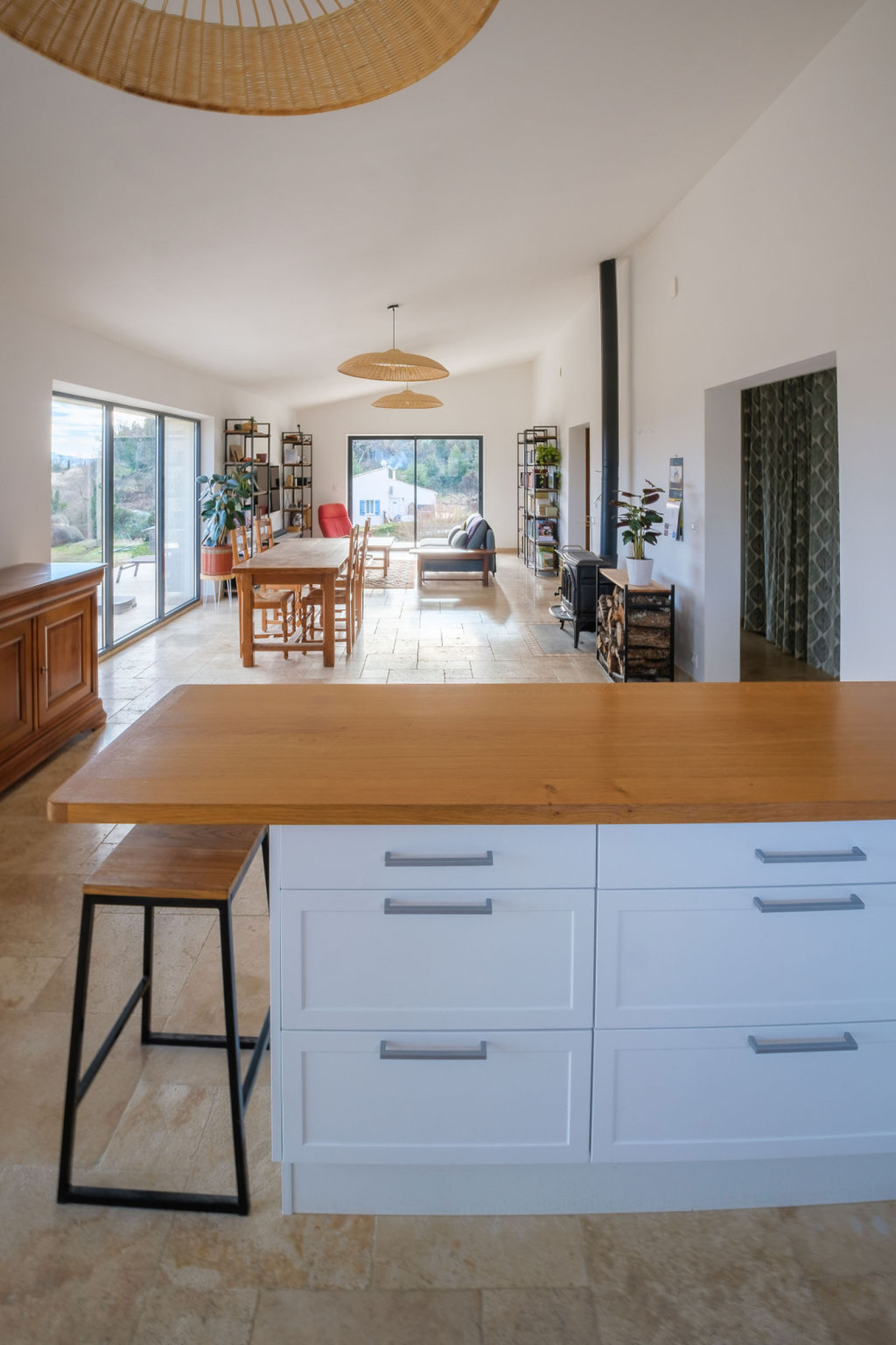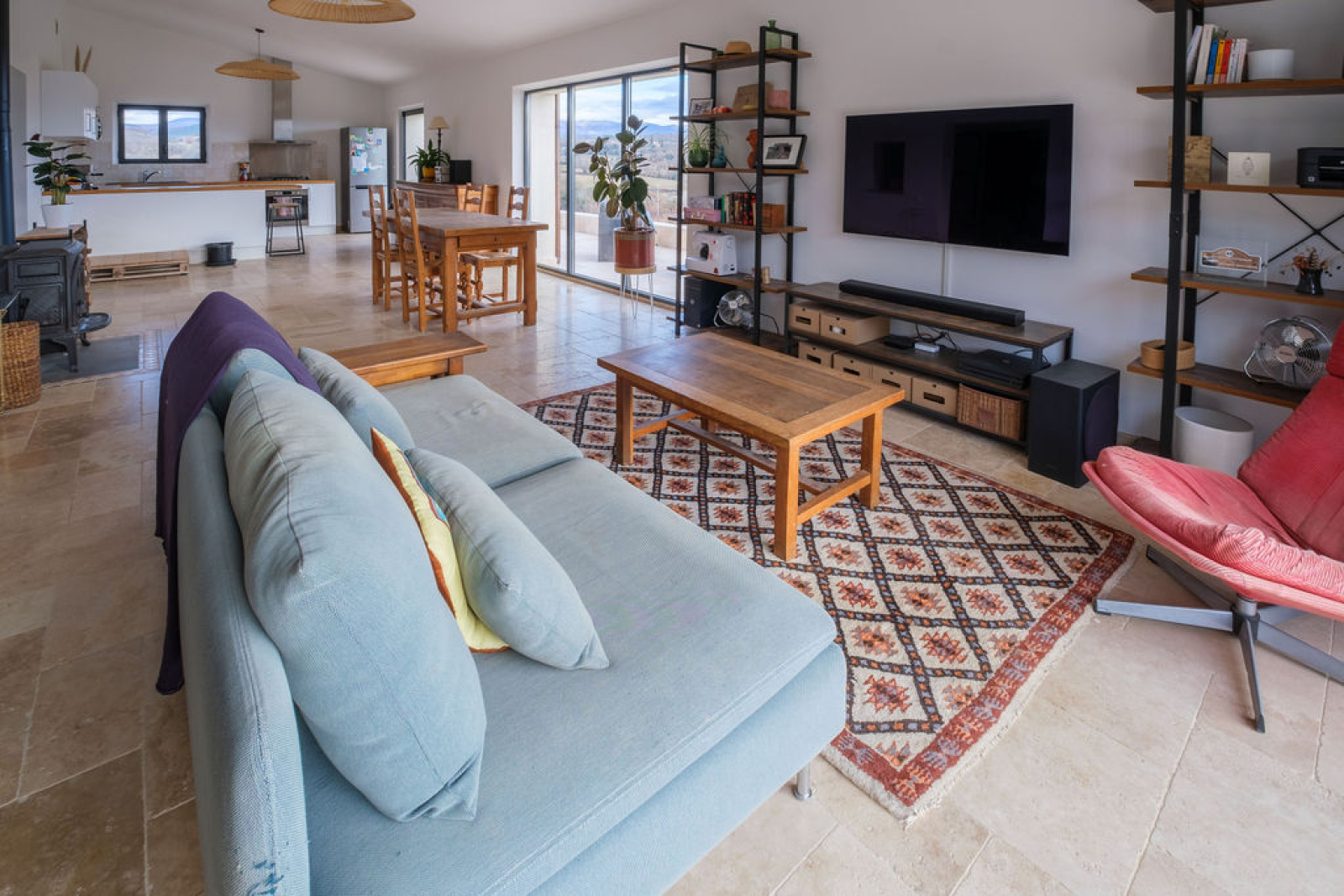 Une grande terrasse en travertin permet de profiter de la vue dégagée sur le pays de Forcalquier, le plateau de Valensole, la montagne de Lure et les Alpes du sud .