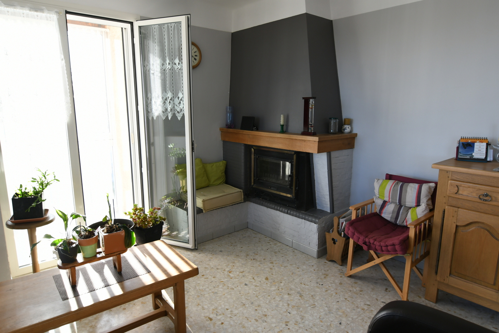 La maison se compose d'un hall avec sas d'entrée, une cuisine claire équipée récente, un salon séjour avec cheminée insert, 2 chambres avec placards, une salle d'eau ( lavabo, douche cabine, sèche serviettes).