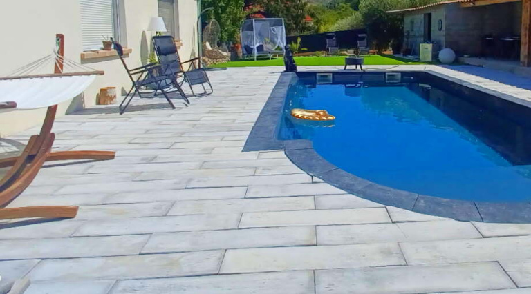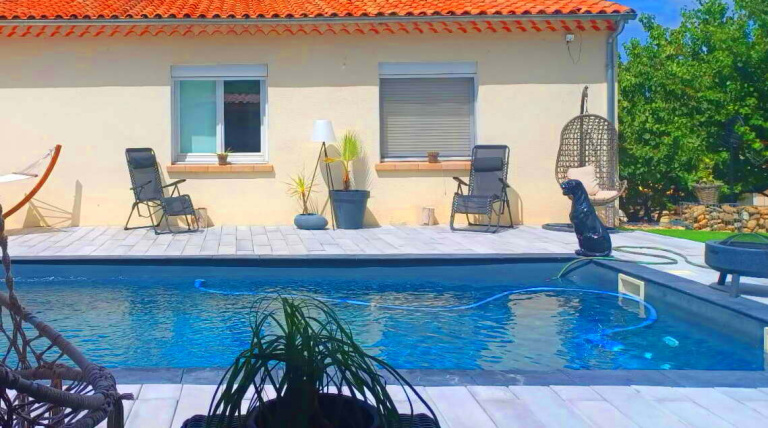 Elle profite d'un jardin arboré , d'un garage moto , et d'une piscine à l'abri des regards .