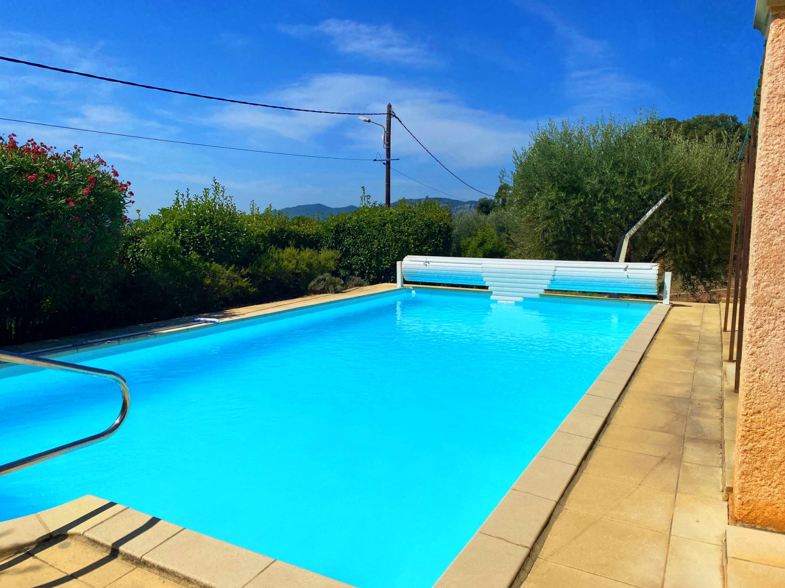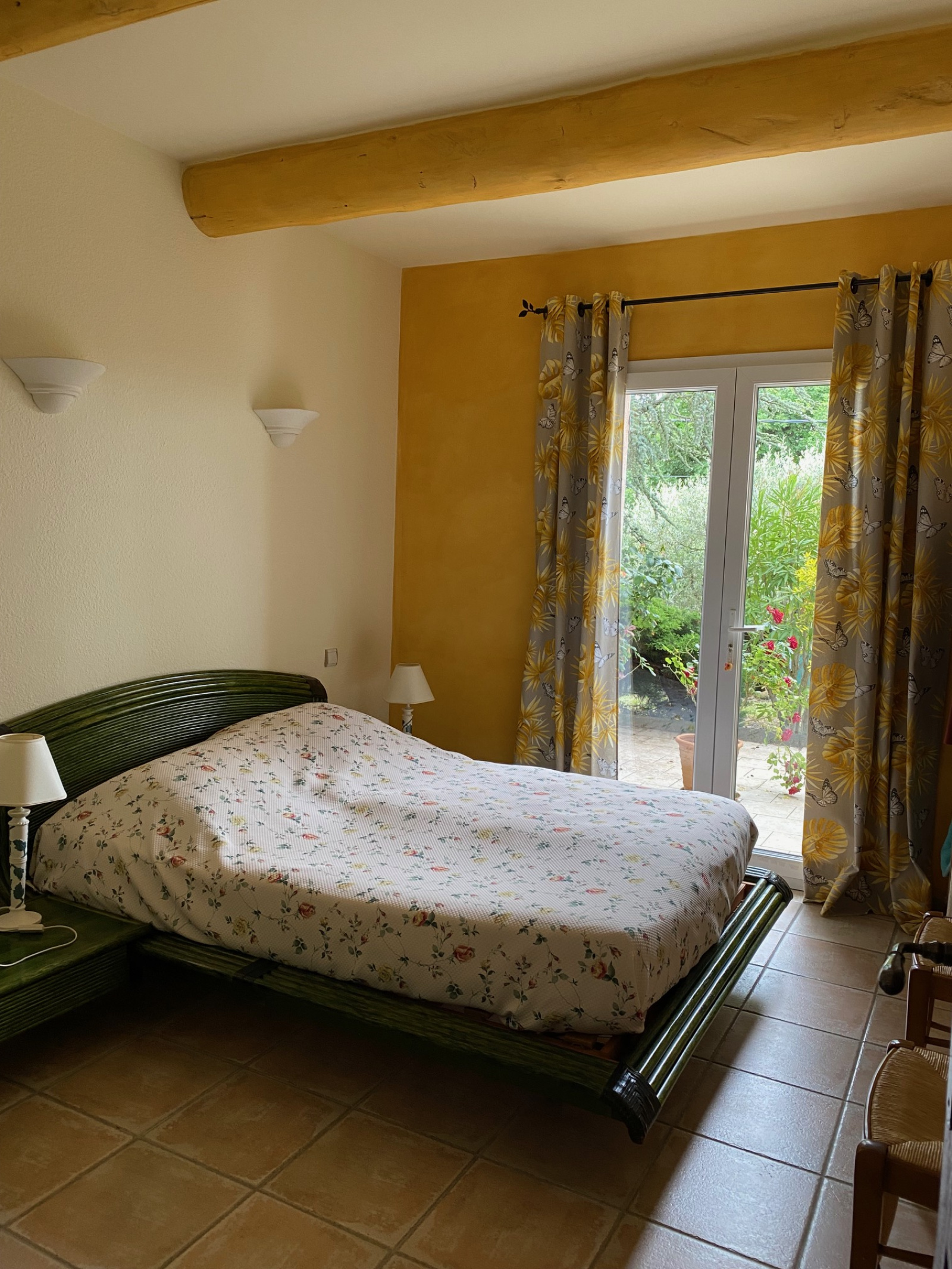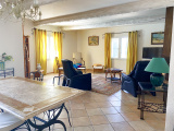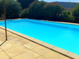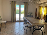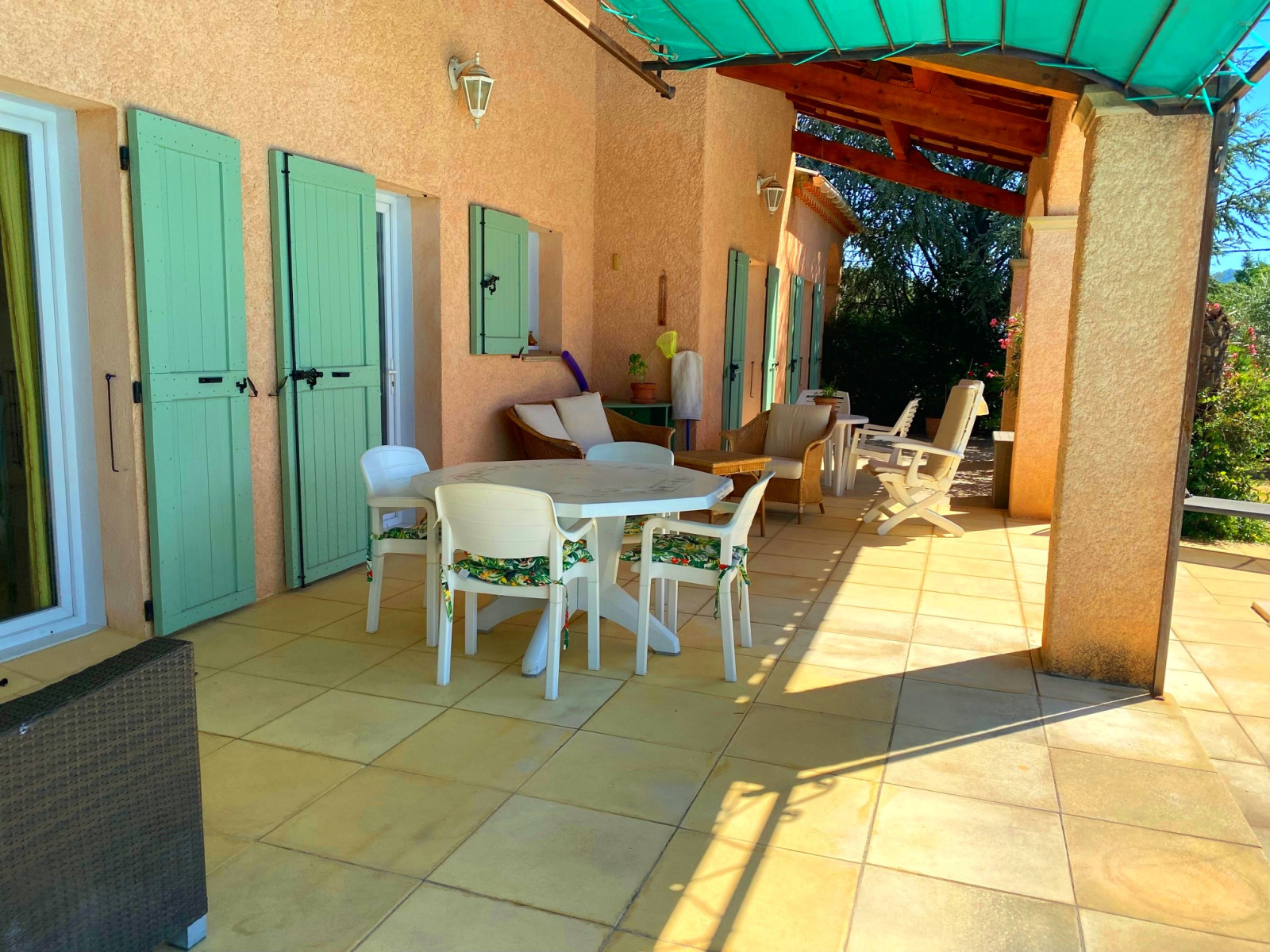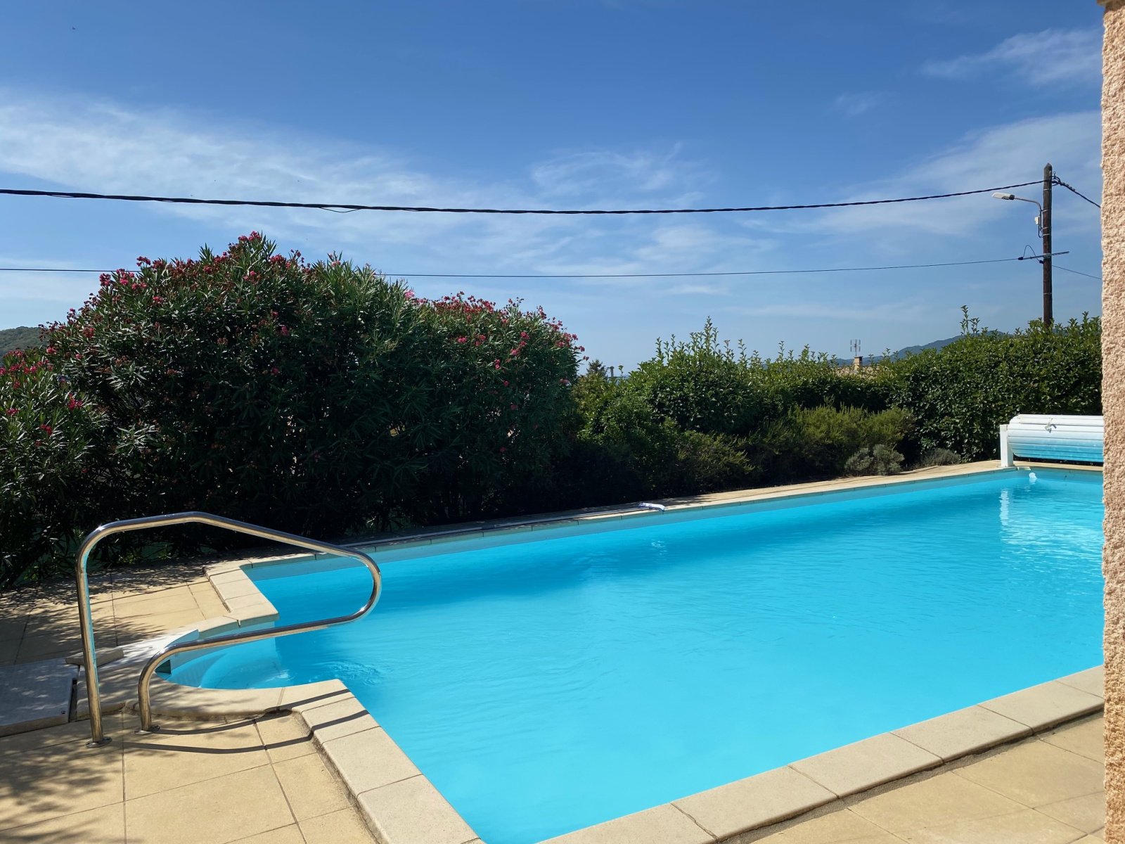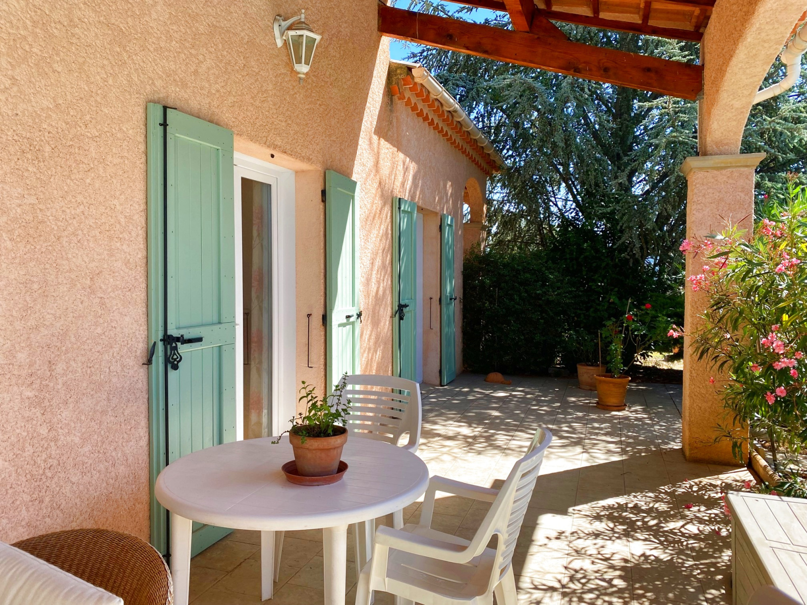De plain pied, orientée plein sud, la villa offre une entrée avec coin bureau , un grand séjour avec cheminée, donnant sur les terrasses et la pisicne , une cuisine indépendante provençale , équipée et meublée