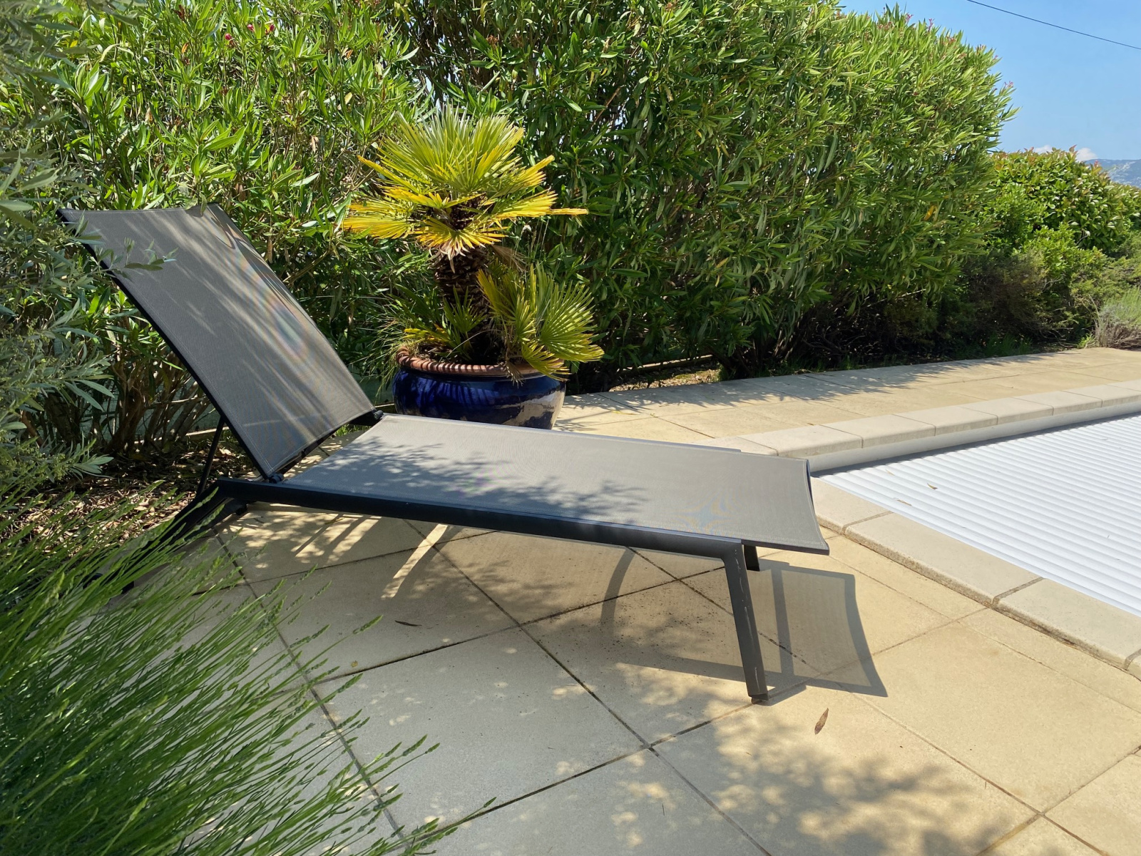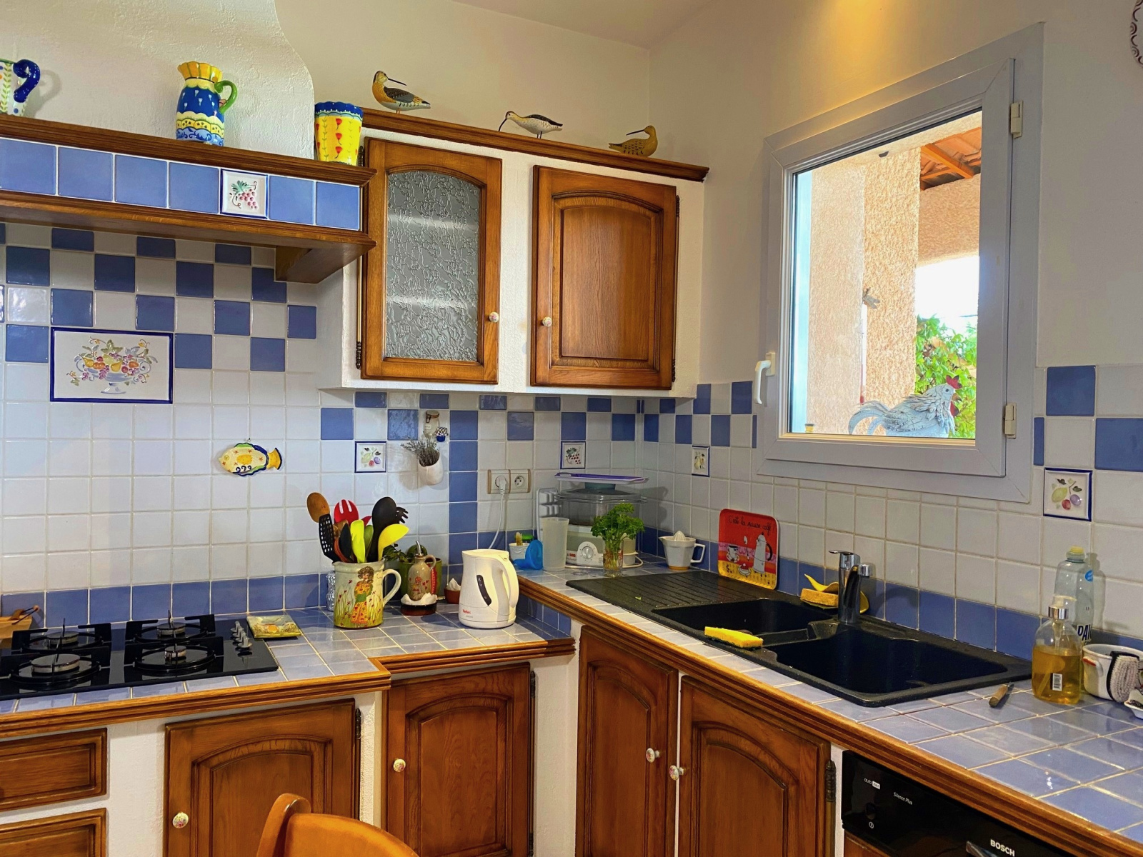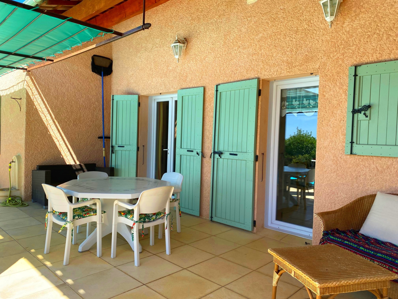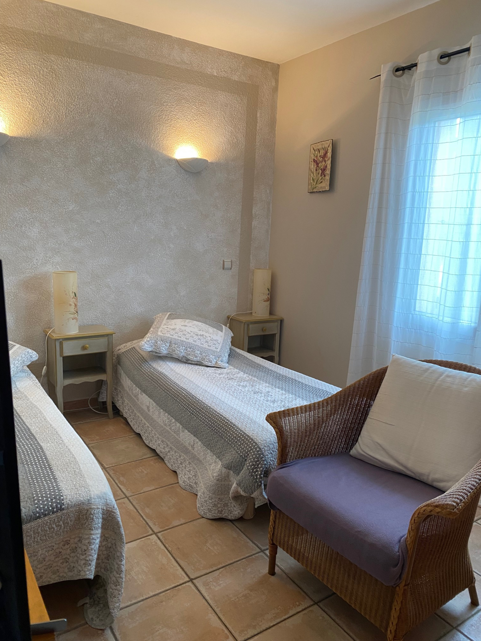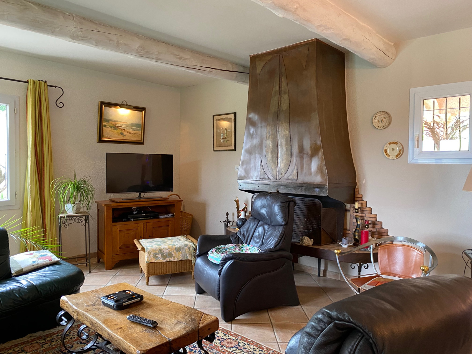 De plain pied, orientée plein sud, la villa offre une entrée avec coin bureau , un grand séjour avec cheminée, donnant sur les terrasses et la pisicne , une cuisine indépendante provençale , équipée et meublée