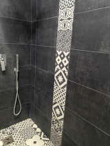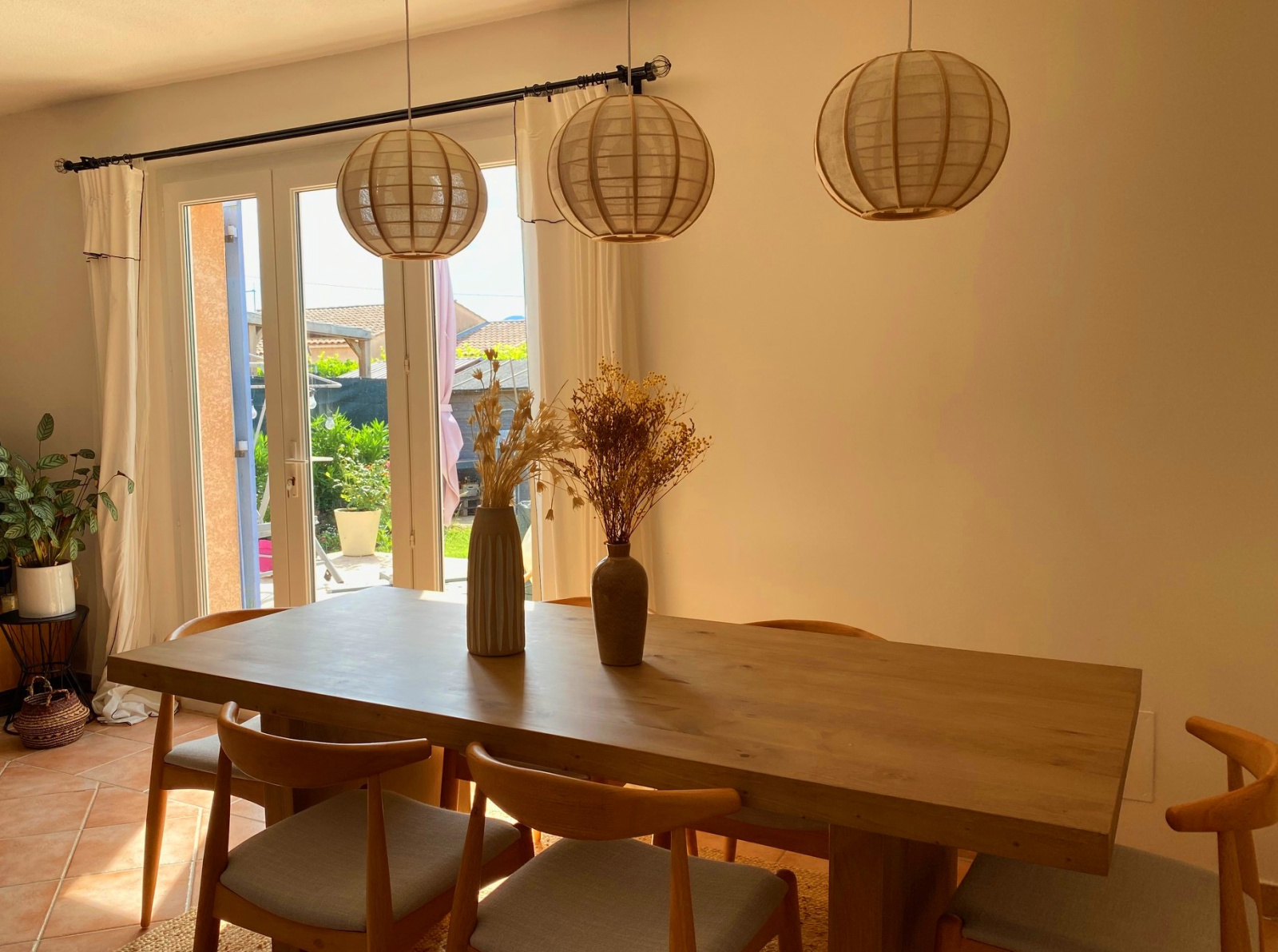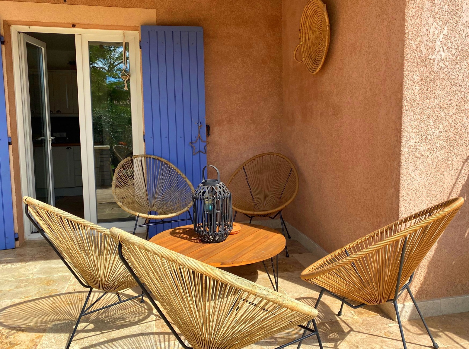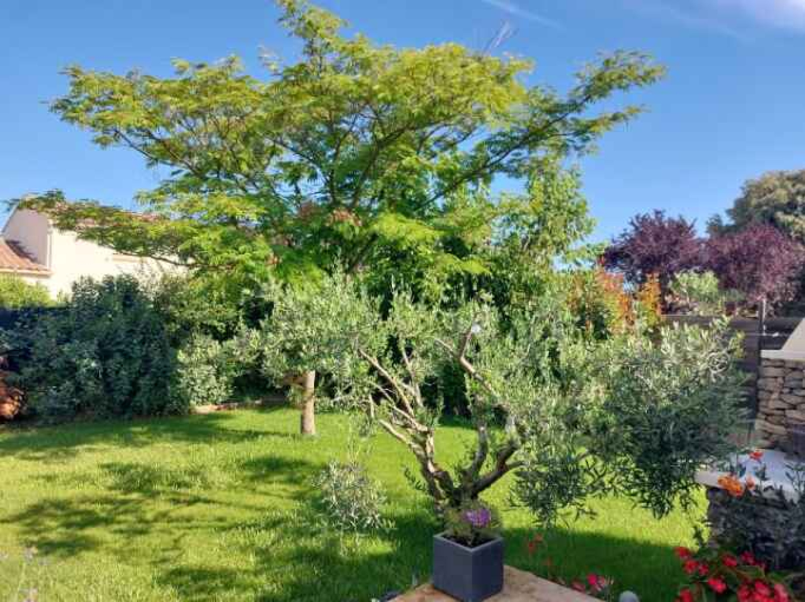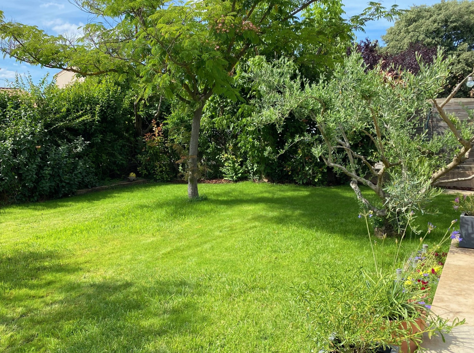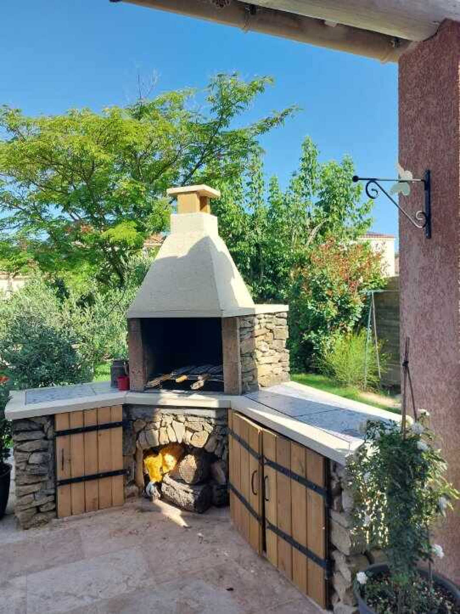 Coté jardin , une terrasse de 53 m² , avec barbecue et un chalet de jardin . Arrosage automatique et forage .