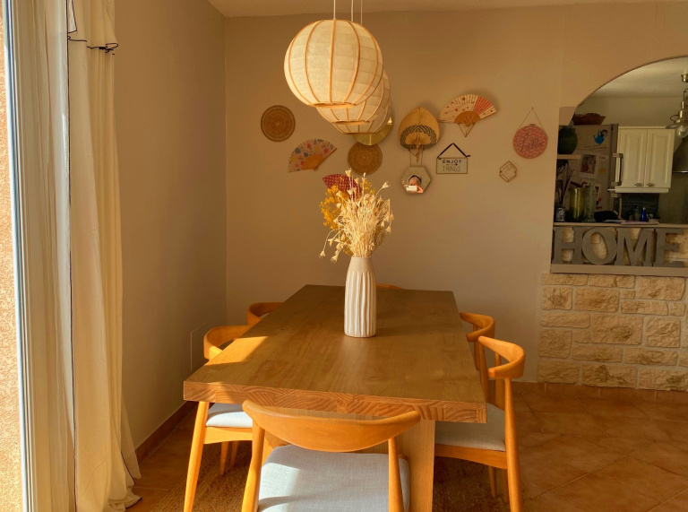 La maison de 117 m² offre une entrée, une cuisine de 12 m² équipée et meublée avec accès terrasse , ouverte sur un double séjour de 32m² , trois chambres , et une très belle suite parentale avec salle d'eau et dressing , une salle de bains , espace buanderie et wc indépendant