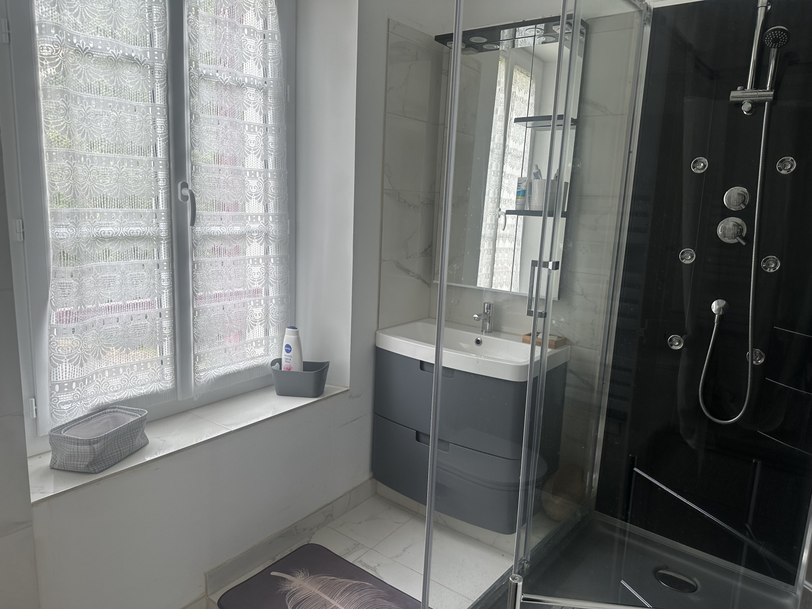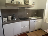 A l'étage, une cuisine équipée et aménagée,une salle à manger, une chambre, une salle d'eau, wc. Fenêtres PVC, double vitrage, électricité et sanitaires refait à neuf. Radiateurs électriques . Tout à l'égout. Aucun travaux à réaliser.